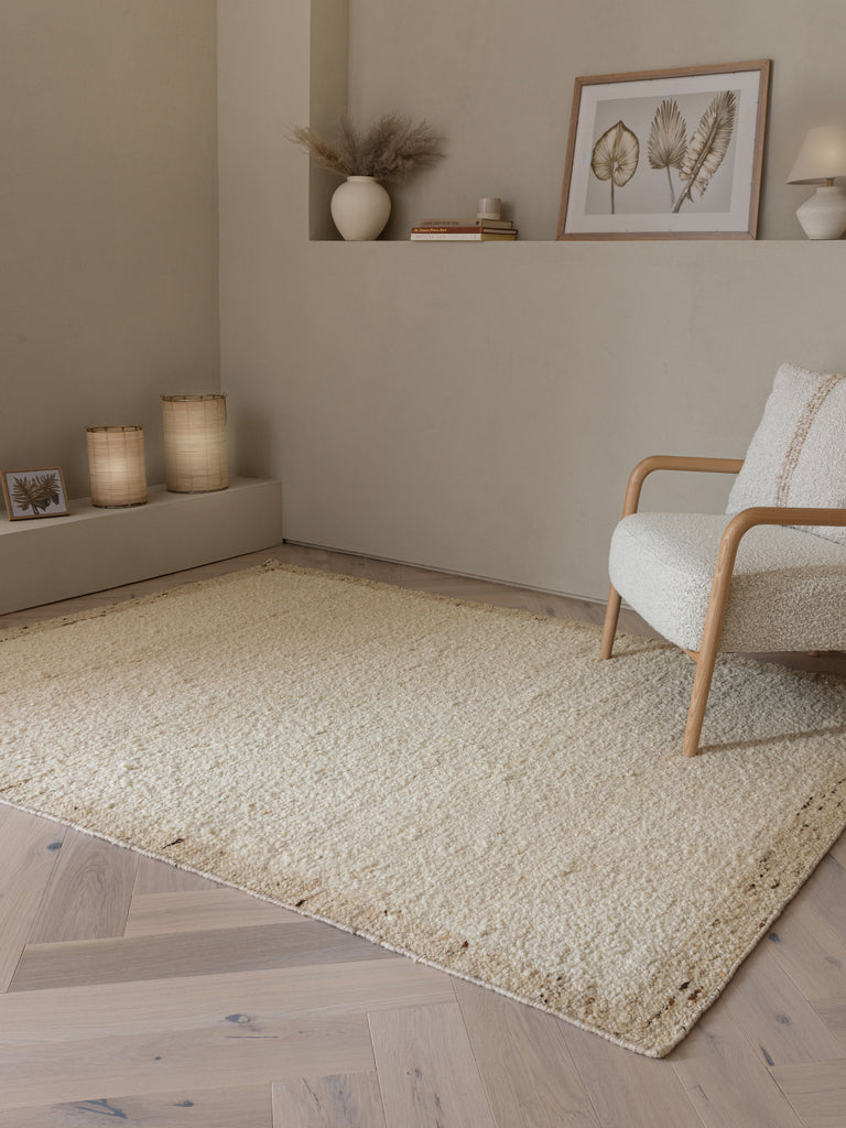 Made with hand-spun wool and woven with natural variations that reflect its handmade origin. The simplicity of design embraces texture, irregularity and authenticity. 93% wool 7% cotton - 10mm pile height