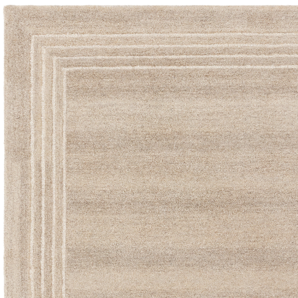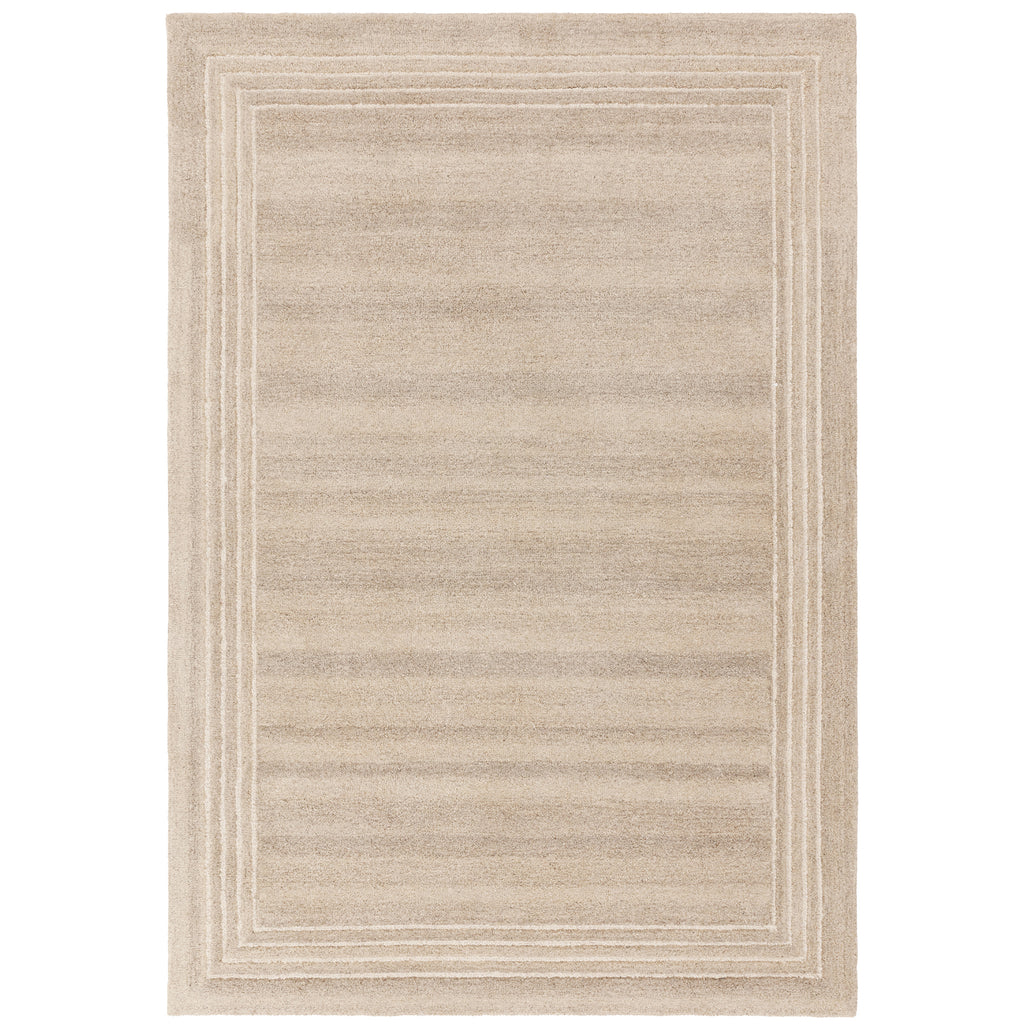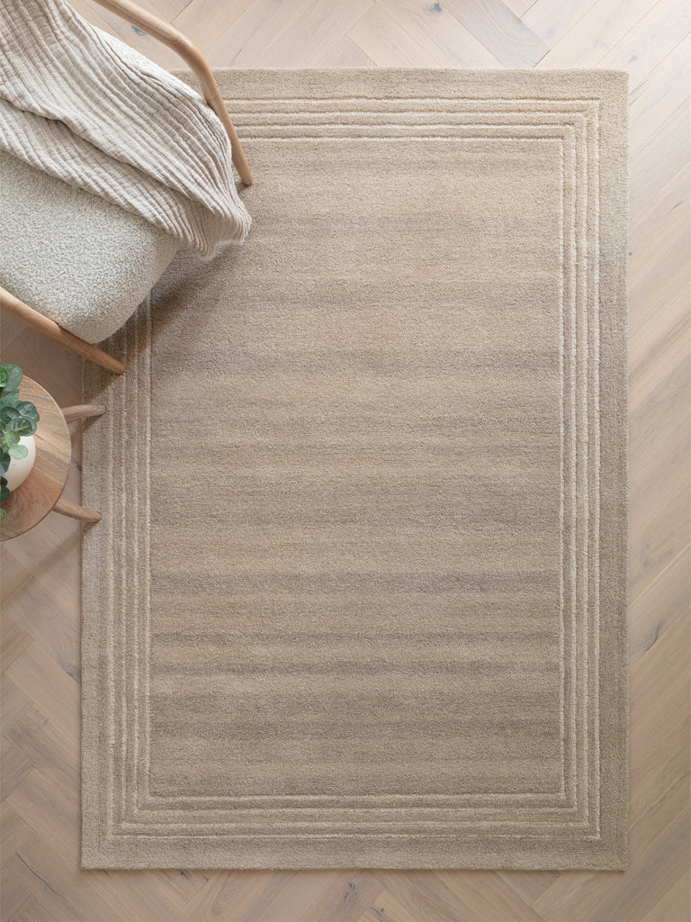 Orlo is crafted from undyed wool , featuring neutral, undyed tones for an organic appeal, elegantly framed with white loops that create a structured border. 100% wool - 10mm pile height
