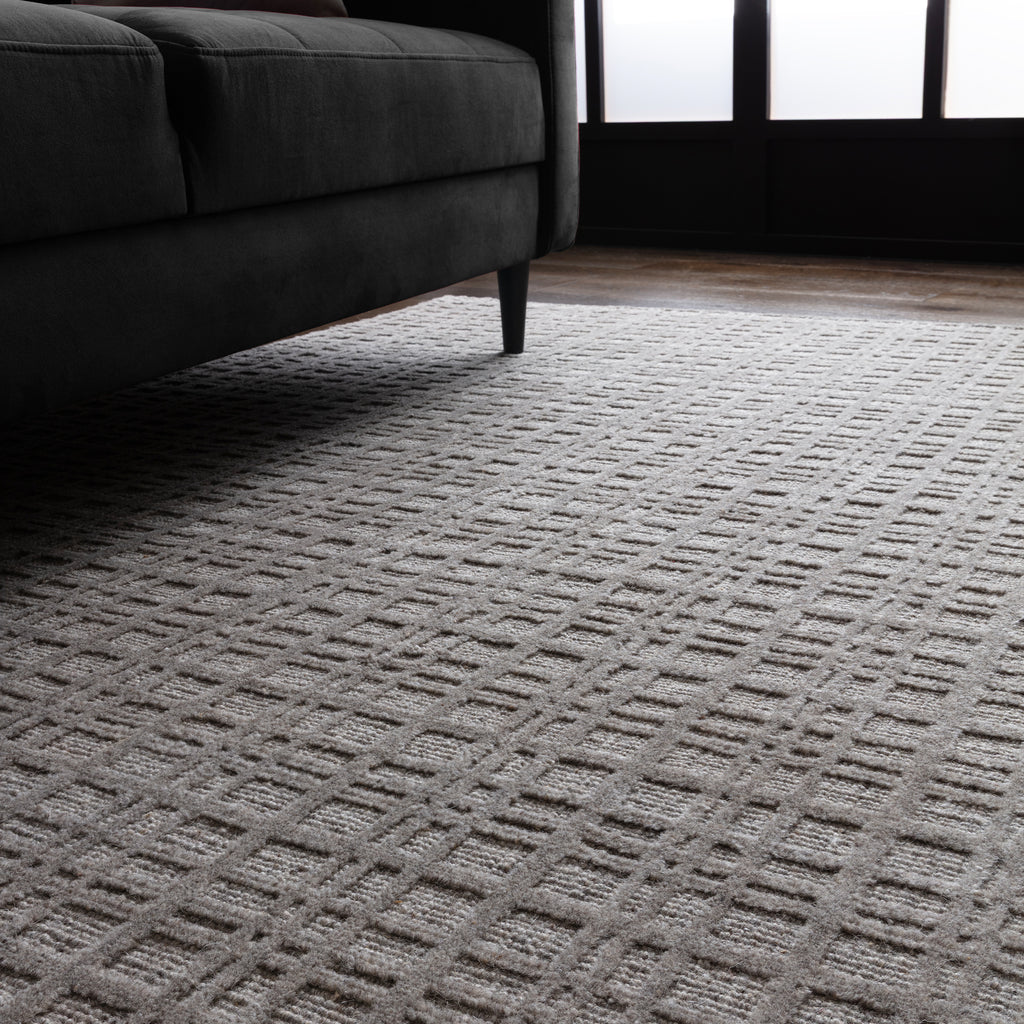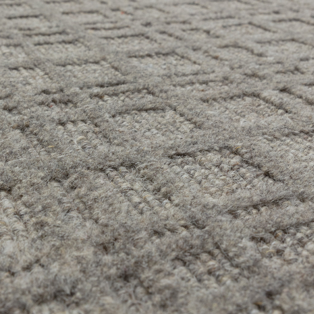 Thatch is woven by hand from undyed wool , accentuated with a low loop base and high cut pile that forms a multi-dimensional grid. -  72% wool 28% polyester - 5mm pile height